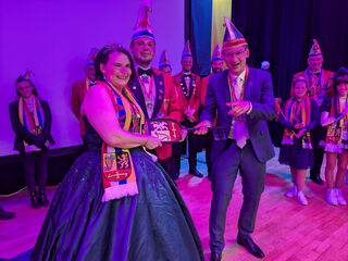 Gut gelaunte Schlüsselübergabe mit (v.l.) Maike I von der Sonnenstadt, Sitzungspräsident Marco Ebinger und Bürgermeister Thorsten Walther.
