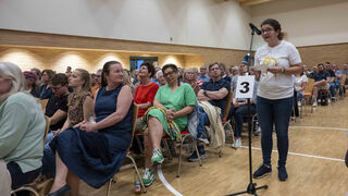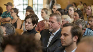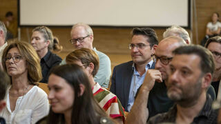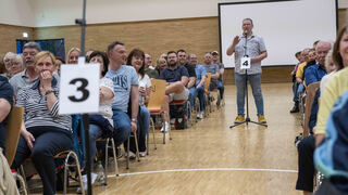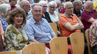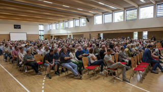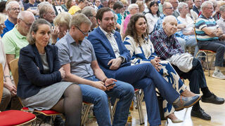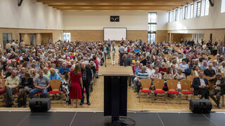 Zahlreiche Neulußheimer Bürger, darunter Andreas Sturm MdL, sind zur Kandidatenvorstellung in die Heidemann-Halle gekommen. Auch Hallen-Namensgeber Rolf Heidemann lässt es sich nicht nehmen, in vorderster Reihe teilzunehmen.