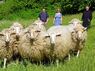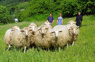 Vor gut einer Woche hat das Stift wieder die Landwirtschaft des Klosters übernommen. Erste neue Bewohner sind acht Waldschafe, die sich gerade eingewöhnen. Dahinter (v.l.) die beiden Geschäftsführer der neugegründeten Ökonomie Stift Neuburg GmbH Mathias Braun und Claudia Rhein sowie Pater Prior Ambrosius.