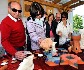 Lorsch; Tag der offenen Gärten und Höfe in Lorsch; Skulpturen, Lampen, Schmuck, Körperformen aus Ton, Holz und Metall von Oliver Schweikart; Bild: Dietmar Funck