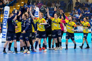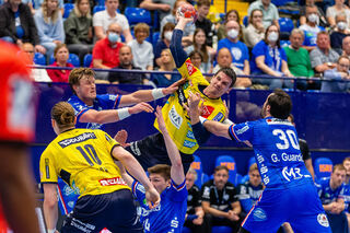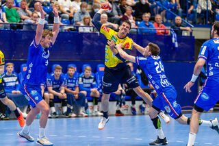 Andy Schmid hält den Ball gegen Lukas Zerbe und Jonathan Carlsbogard vom TVB Lemgo Lippe.