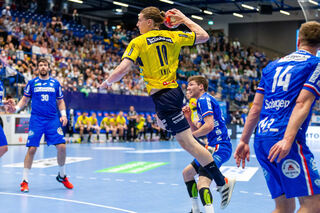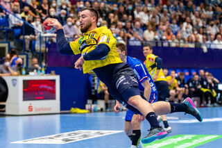 Löwen-Spieler Juri Knorr setzt zum Wurf an.