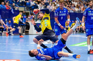 Frederik Simak (TVB Lemgo Lippe) stürzt vor Löwe Jannik Kohlbacher.