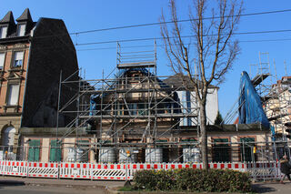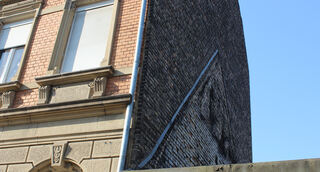 Der Abdruck des linken Giebels des abgebrannten Dachgeschosses des Relaishauses an der Brandmauer des Nachbargebäudes.