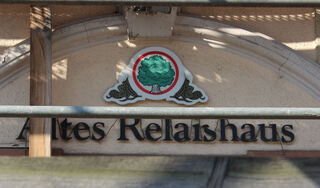 Der Schriftzug mit dem Namen des Relaishauses und das Wappen der Mannheimer Eichbaum-Brauerei, des früheren Bier-Lieferanten der hiesigen Gaststätte.