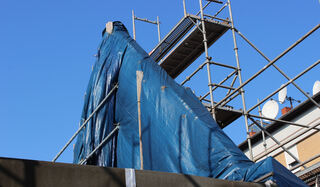 Der rechte Giebel, der als einziges von dem ausgebrannten Dachgeschoss übriggeblieben ist.