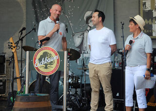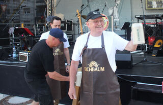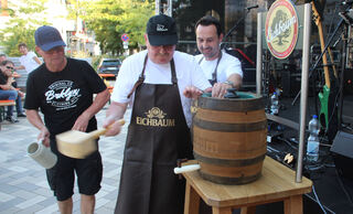 Höhepunkt des Freitagabends: der Festbieranstich. Wolfgang Göck schlägt zu, Andreas Flisiak sowie Jürgen Kirner vom Bierstand assistieren.