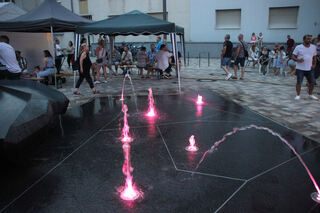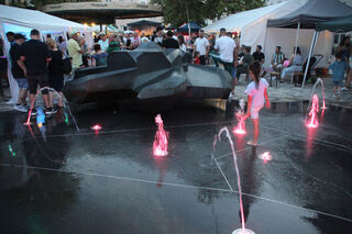 Die kleinen Festbesucher genießen das Ambiente und das kühle Nass der Wasserstrahlen.