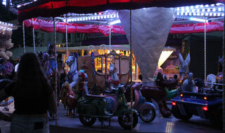 Ist es nicht wunderbar, in dieser illuminierten abendlichen Atmosphäre auf dem Kinderkarussell zu fahren?