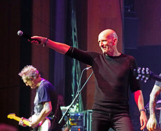 Eric Bazilian, Kopf der Band "The Hooters" spielt viele Instrumente, unter anderem auch die Hinterkopf-Gitarre.