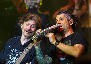 Bazilian hat seinen Spaß mit dem Keyboarder und Melodica-Spieler der Mat Sinner-Band, Zlatko Jimmy Kresic.