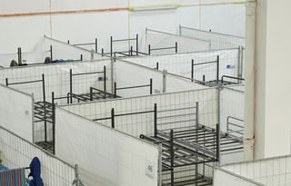 Ein Blick in unbezogene Parzellen mit Stockbetten.