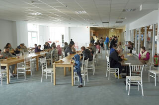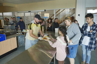 Zum Teil arbeiten Geflüchtete in der Küche und bei der Ausgabe mit.