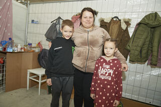 Liudmyla Svavoliuk gewährt mit ihren Kindern Kiryl (l., 9 Jahre) und Bohdana (6 Jahre) einen Einblick in ihre Parzelle.