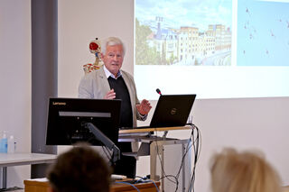Im Hörsaal. Volker Voigtländer (NABU Heidelberg) referiert über Mauersegler, die hier zu finden sind.