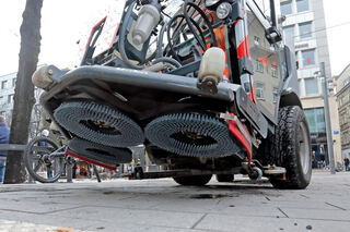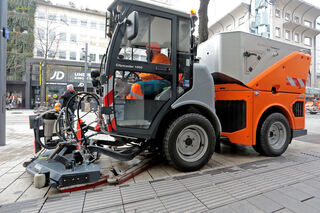 Ein Fahrzeug der Stadreinigung säubert das Pflaster.