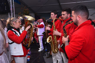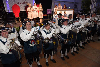 Mit schmissigen Rhythmen der Band werden die scheidenden Weinhoheiten ein letztes Mal auf der Bühne begrüßt . . .