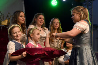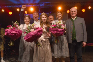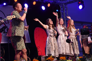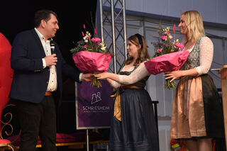 Blumen gibt es am Ende vom Bürgermeister für die beiden Organisatorinnen und Moderatorinnen des gelungenen Krönungsabends, Sophie Koch und Lisa Menges (r.).