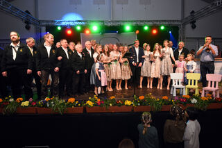 Prachtvolles Schlussbild zum Finale dieses Krönungsabends: die Weinhoheiten mit den musikalischen Akteuren, den Sängern des Gesangvereins Eintracht und den Honoratioren der Stadt auf der Bühne.