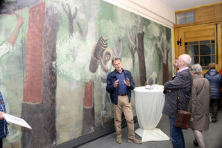 Erich Schuh von der Galerie Schäfer präsentiert das neu entdeckte und gerettete Wandgemälde von Heinz Friedrich.
