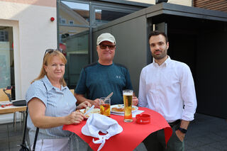 Björn Becker, Regionalleiter der Sparkasse Heidelberg (r.), begrüßte die Besucher und plaudert hier mit Thomas und Christine Straub.