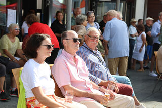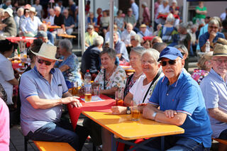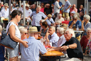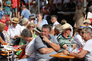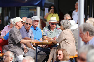 Matthias, Rolf, Leopoldine und Jutta genießen das tolle Wetter und die Jazzmusik auf dem Jazzfrühschoppen.