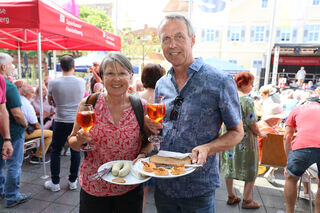Brigitta und Kai aus Schwetzingen lassen es sich mit Weißwurst, Obazda und Aperol Sritz gut gehen.