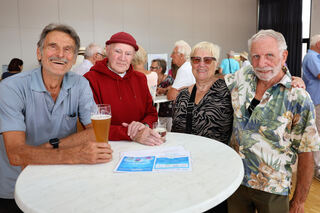Eine gesellige Runde: Erich Schuh, ehemaliger Kassenprüfer der Jazzinitiative Schwetzingen (JIS), Aart Gisolf, Ehrenvorsitzender der JIS, Claudia Lohmann, zweite Vorsitzende der JIS sowie das treueste Mitglied der JIS, Erich Hoffmann.