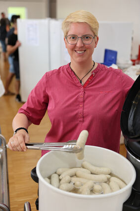 Weißwustbrühen mit göttlichem Beistand: Pfarrerin Dr. Franziska Beetschen gibt ihr Bestes.