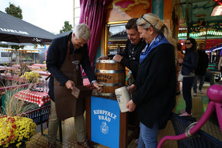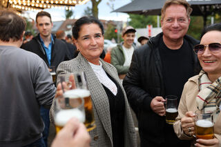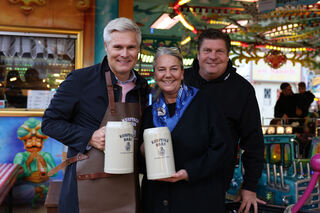 Prost! Bürgermeister Matthias Steffan und Conny Clark als Veranstalterin der Kerwe sowie Jens Kietzmann von der Welde-Brauerei.