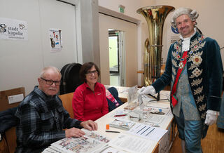 Am Stand der Stadtkapelle: Churfürst (Rene Kolb) macht mit beim Schätzspiel und wirft sein Ergebnis in die Box. Gerd Feurer und Christa Barz beaufsichtigen die Sache.