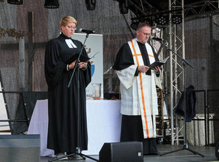 Ökumenischer Gottesdienst auf den Kleinen Planken mit Pfarrerin Dr. Franziska Beetschen und Pfarrer und Dekan Uwe Lüttinger.