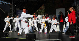 Fränk Storck ist mit seinem Enkel Luca (2,5 J.) am Stand vom SFC Schwetzingen e.V.