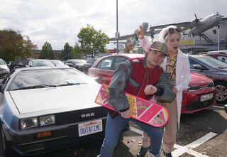 Marty McFly und Doc Emmett Brown sind mit ihrem DeLorean da.