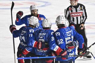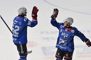 Jubel nach dem Sieg v.l. Mannheims Nicolas Mattinen (Nr.52) und Mannheims Zach Solow (Nr.73).