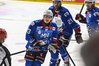 Muenchens Jeremy McKenna (Nr.91) gegen Mannheims Johan Mattsson (Nr.33).