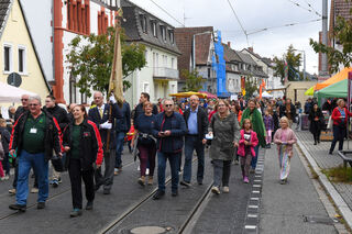 Alle zusammen? Dann los! Der Kerwezug marschiert durch die Hauptstraße und sammelt auf dem Weg immer wieder Menschen ein.