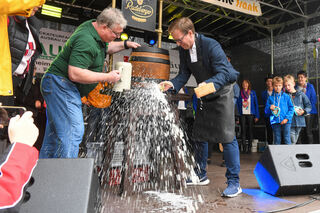 Was wäre eine Kerwe ohne Fassbier? Holger Schmitt (Leiter JVA) beim schwungvollen Anstich.