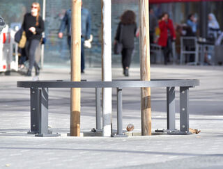 Baumschutzbügel: Damit die neuen Schattenspender möglichst lange stehen und unversehrt bleiben, sind sie von anthrazitfarbenen Metallringen eingefasst. Sie sollen die Bäume vor möglichen Zusammenstößen mit Lieferwagen schützen. Passanten können sie zum Sitzen nutzen. Ausdrücklich nicht erlaubt ist es, Fahrräder daran zu befestigen.