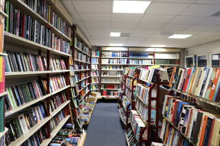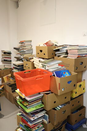 Einen so hohen Bücherstapel soriert eine Mitarbeiterin des Markthauses jeden Tag.