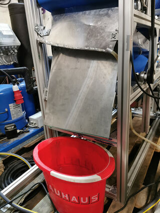 Und so funktionierts: Das Salzwasser in diesem Bottich wird heruntergekühlt, damit es an den Innenwänden gefriert. Eine Transportschnecke kratzt dann das Eis ab und schiebt es nach oben auf ein blaues Förderband.