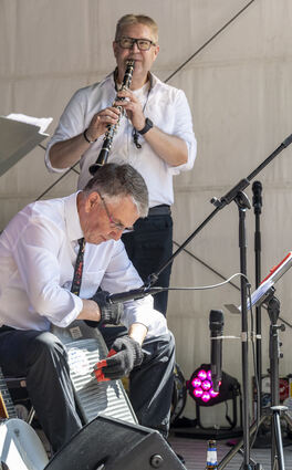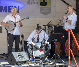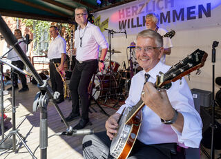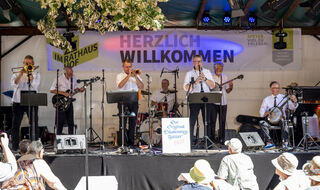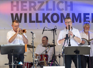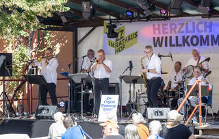 Zum Abschluss begeistert die Band "Die Original Blütenwegjazzer" in der Besetzung Prof. Bruno Weis am Gitarrenbanjo, der Ukulele und dem Waschbrett, Hubert Ensinger mit der Trompete, der Posaune, dem Akkordeon und Gesang, Markus Jörg, an der Klarinette und dem Saxophon, Dieter Kordes am Piano, dem Akkordeon und Gesang, Günter Flassak am Bass, Dr. Rainer Dorstewitz am Tenorbanjo sowie Hans-Jürgen Götz am Schlagzeug.