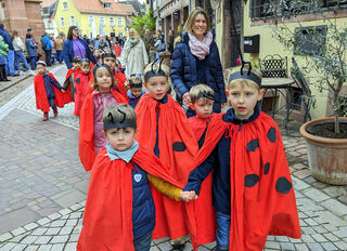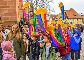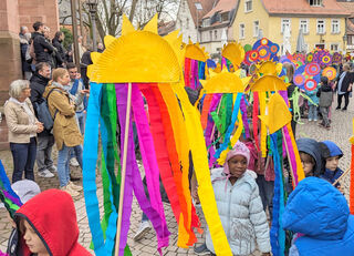 Kinder aus der Dalberg-Grundschule tragen bunte Sommertagstecken durch die Straßen und Gassen. Bild: Peter Jaschke