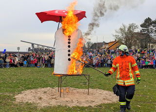 Der Höhepunkt des Sommertagszugs: Da geht sie in Flammen auf, die leere Pappmachéhülle der Schneemannfigur.