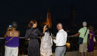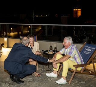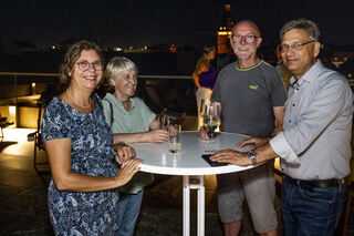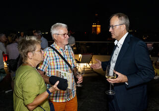 Das Tolle: Till Meßmer lädt die Gäste auf das Dach des Vereinte VR Bank Forums ein. Der Blick über das abendliche Speyer ist wunderschön.