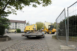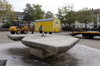 17. Oktober 2011: In Speyer-West starten die Bauarbeiten zur Umgestaltung des Berliner Platzes, der sich mittlerweile in einem unschönen Zustand praesentiert und dringend sanierungsbedürftig ist, die ersten Baugeraete werden angeliefert.