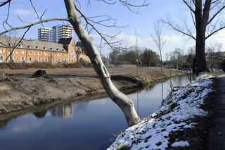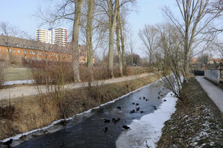 15. März 2013: Die Renaturierung des Baches Woogbach und Umgestaltung des Woogbachtal und damit die Verbesserung der Lebensqualität in Speyer-West macht Fortschritte und man kann bei Spaziergängen die ersten Veraenderungen anschauen, Blick Richtung Osten, das Bachufer verläuft nun unregelmäßig, im Wasser spiegelt sich das im Volksmund "Max und Moritz" genannte Hochhaus.