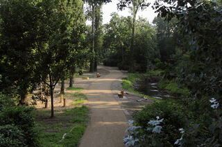 10. Juli 2013: Die Renaturierung des Baches Woogbach und Umgestaltung des Woogbachtal und damit die Verbesserung der Lebensqualität in Speyer-West macht Fortschritte und man kann bei Spaziergängen schon größere Veraenderungen anschauen, hier ein Blick von der Bruecke in der Burgstraße Richtung auf den fast schon fertigen Bereich Richtung Nordost zur Friedrich-Ebert-Straße.