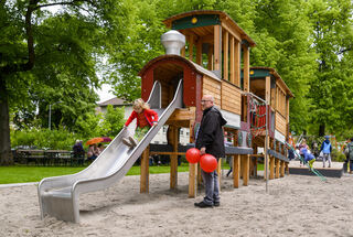 11. Mai 2019: Ein in der Vergangenheit kaum genutzter Grünstreifen in der Josef-Schmitt-Straße wurde nach mehreren Bürgerbeteiligungsverfahren im Rahmen der "Sozialen Stadt Speyer-West" aufgewertet und unter anderem mit Sitzbänken und neuen Spielgeräten zu einem Aufenthaltsbereich für alle Generationen umgestaltet. Mit dem Spielfest "Voll was los" wird die Fläche im Rahmen des "Tag der Städtebauförderung" den Bürgern übergeben. Dieses Spielgerät in Zugform erinnert an die Lokalbahn Neustadt-Speyer, auch Gäubahn oder "Pfefferminzbähnel" genannt, die hier verlief.
