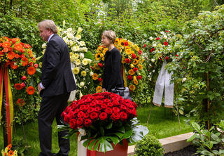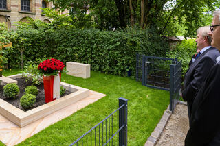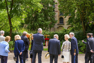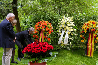 Begleitet vom Landtagsabgeordneten Michael Wagner rückte Witwe Maike Kohl-Richter die Kränze zurecht.